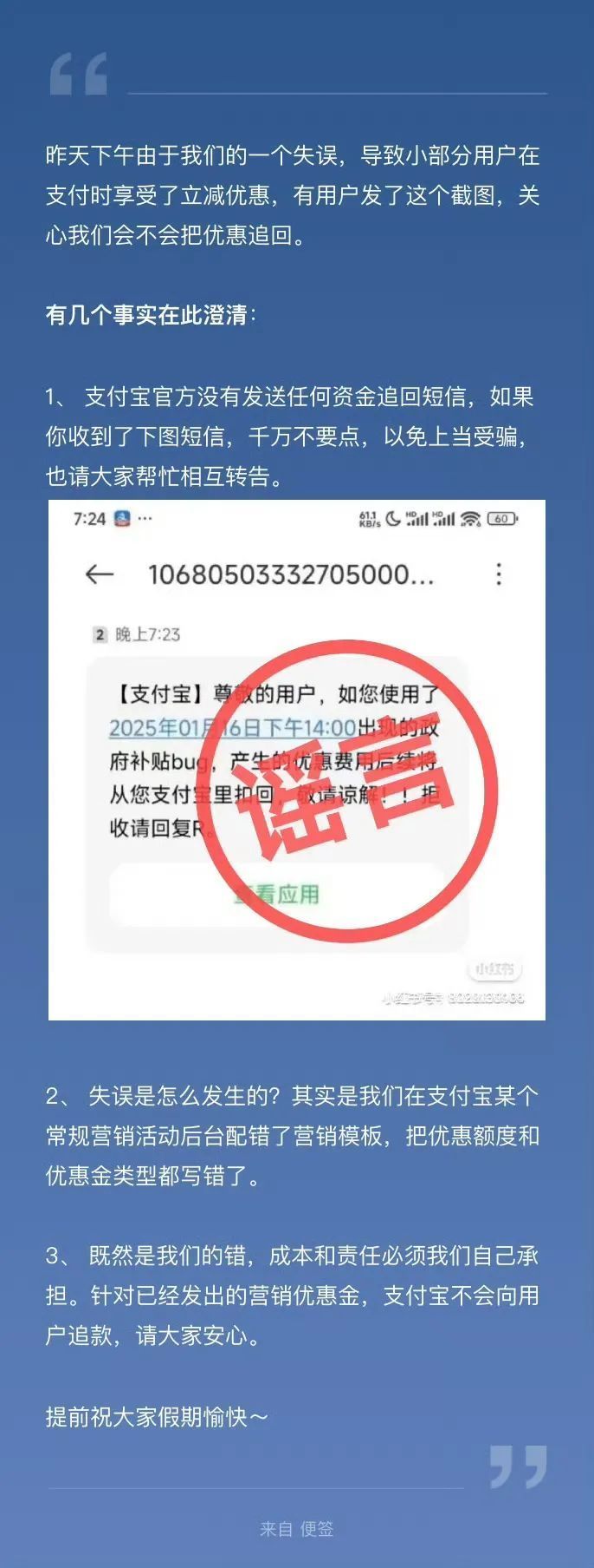1月17日凌晨,@支付宝 发文回应称:昨天下午由于我们的一个失误,导致小部分用户在支付时享受了立减优惠,有用户发了这个截图,关心我们会不会把优惠追回。有几个事实在此澄清: